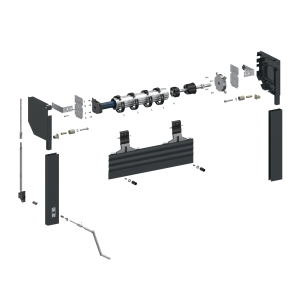 - À l'intérieur du garage, il y a une tringle oscillante qui reste en place en permanence. Elle est reliée à un boîtier qui permet le renvoi du mouvement entre l'intérieur et l'extérieur. Cette tringle peut être retirée du boîtier et utilisée en cas de panne de courant pour ouvrir ou fermer la porte depuis l'intérieur du garage.