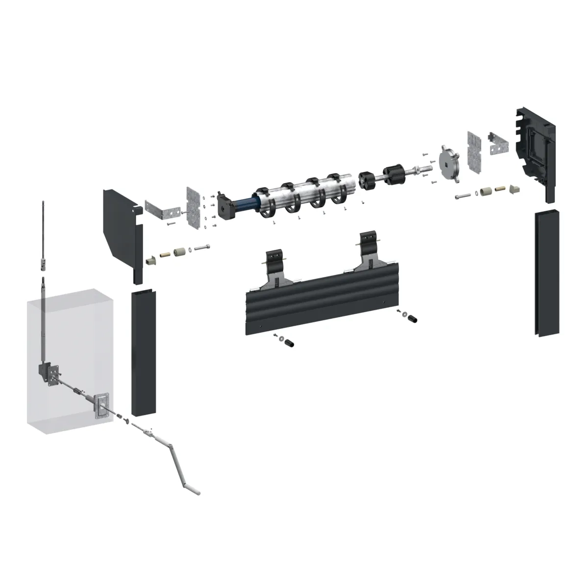 - Une manivelle extérieure avec tige et une grenouillère en cas de pose sur coulisse en particulier.