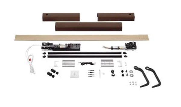 Moteur de volet battant radio Somfy Yslo IO Slim 2 vantaux, carter marron et bras noir