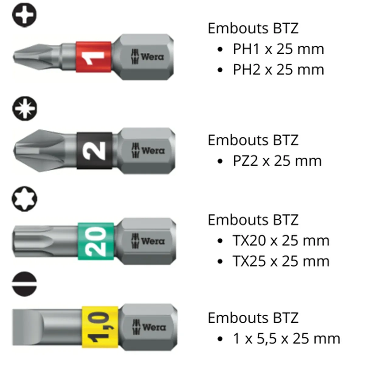 * Embouts BiTorsion BTZ empreinte Phillips : PH1 x 25 mm et PH2 x 25 mm